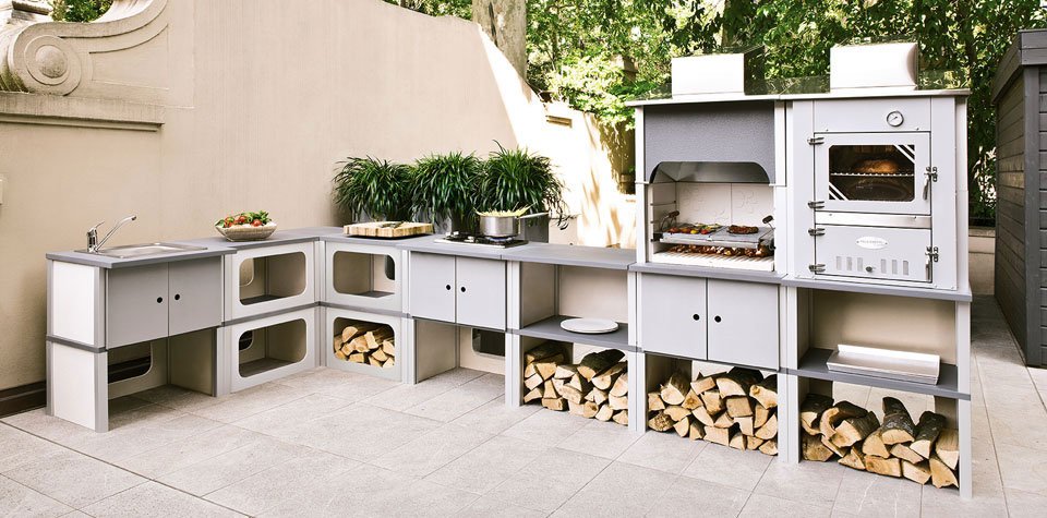 Программа St. Vincent специально разработана для садового расположения. Выполнена из совместимых модулей. Не требует укладочных и штукатурных работ. Легко разбирается и дополняется новыми модулями. Сделана из материалов, устойчивых к погодным изменениям. Духовка и раковина из нержавейки премиум-класса. Модуль гриль с топочной камерой из бетона и решеткой из нержавеющей стали 60х40 см.