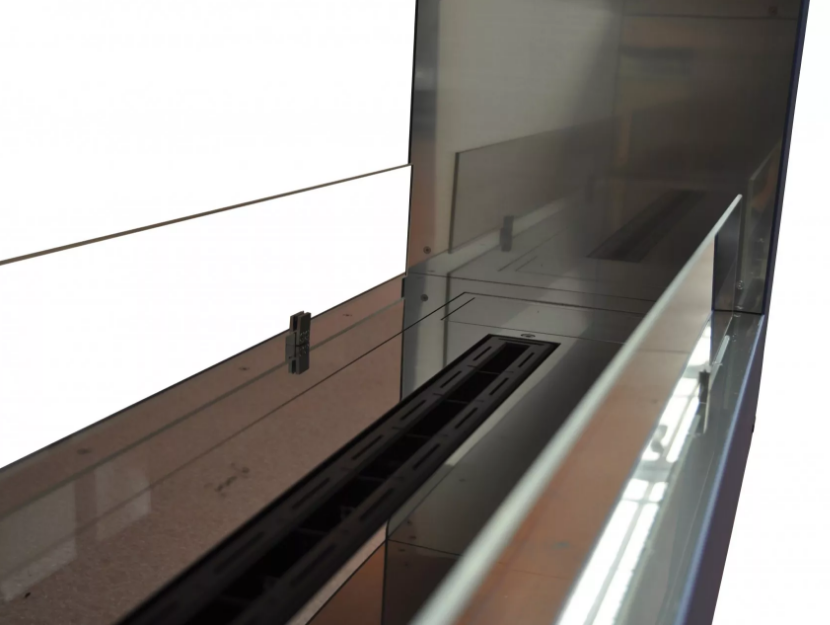 - Топливо, находящееся в отдельной емкости, не контактирует с огнем. Доступ к емкости с биотопливом - под изящной откидной дверцей в правой части горелки. Имеется 3 индикатора уровня топлива: максимальный, средний, низкий. Даже при достижении максимального уровня, в целях безопасности, можно долить одну воронку топлива.