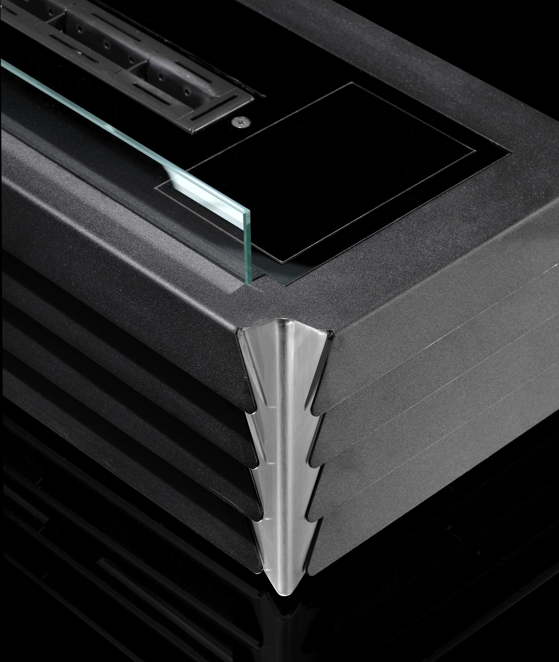 - Варианты отделки биокамина: нержавеющая сталь с черными декоративными углами; сталь, окрашенная в черный цвет, с декоративными углами из нержавеющей стали; оксидированная кортен-сталь с черными декоративными углами (опция).