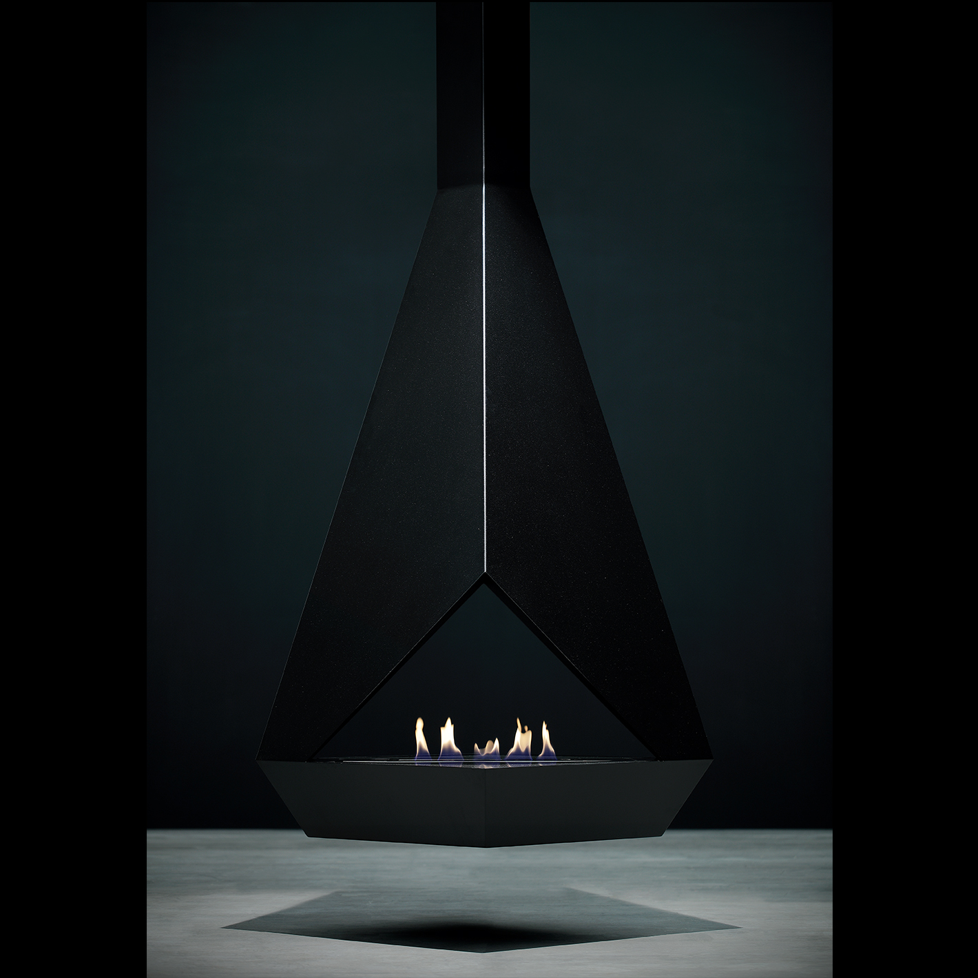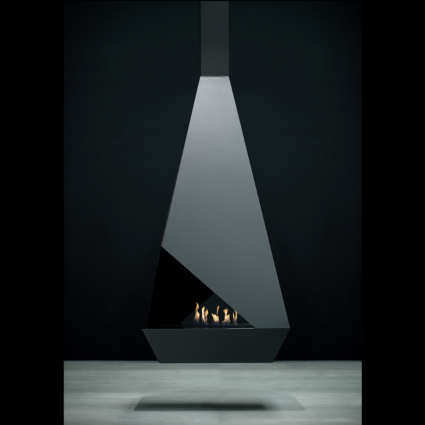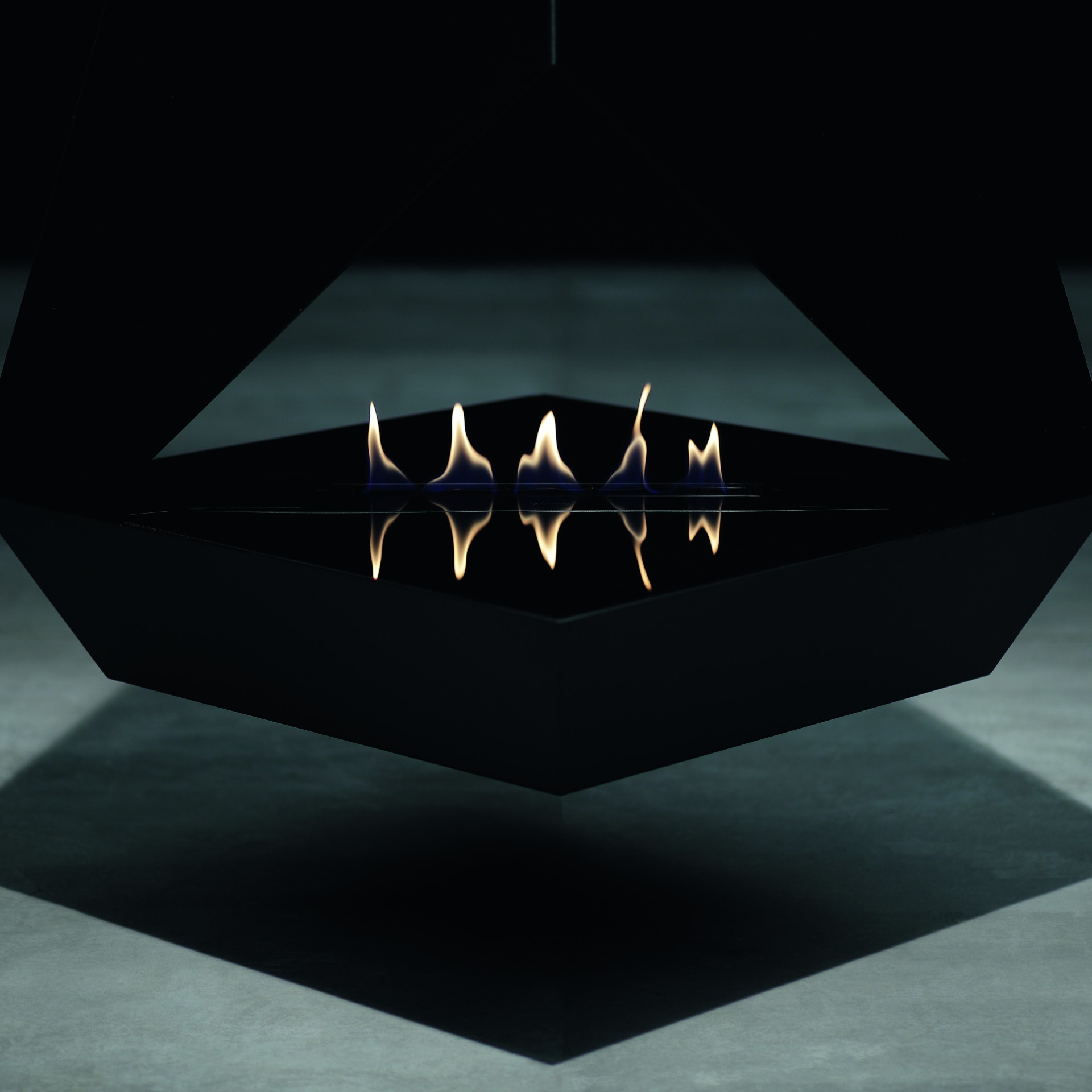 • Все смешалось в дизайне этого подвесного двухстороннего биокамина: плоскости в виде треугольников, трапеций, прямоугольников. Сквозной взгляд через пламя камина делает пространство вокруг таинственным и загадочным.