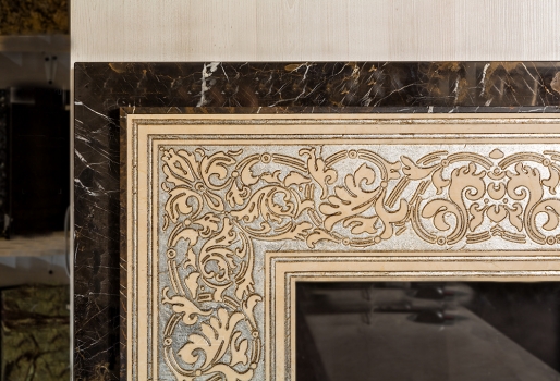 Фронтальный камин лаконичной прямоугольной формы с роскошным флористическим орнаментом, созданным на основе классических древнеегипетских мотивов. Здесь можно увидеть традиционное переплетение стилизованных цветков лотоса и папируса с волютами — изысканными и замысловатыми завитками, направленными в разные стороны.