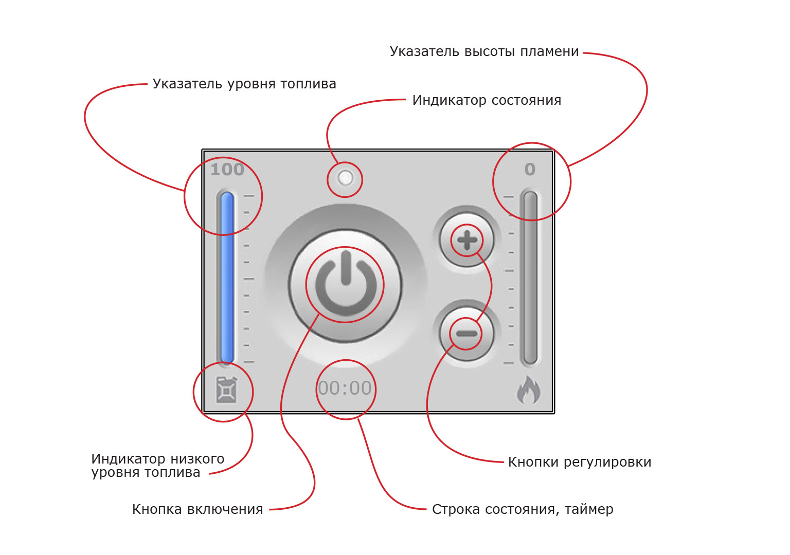 Датчики биокамина: перегрев, тряска, наклон, утечка топлива, превышения уровня углекислого газа. В случае возникновения нештатной ситуации, биокамин автоматически отключается, а на дисплее отображается окно с информацией об ошибке.