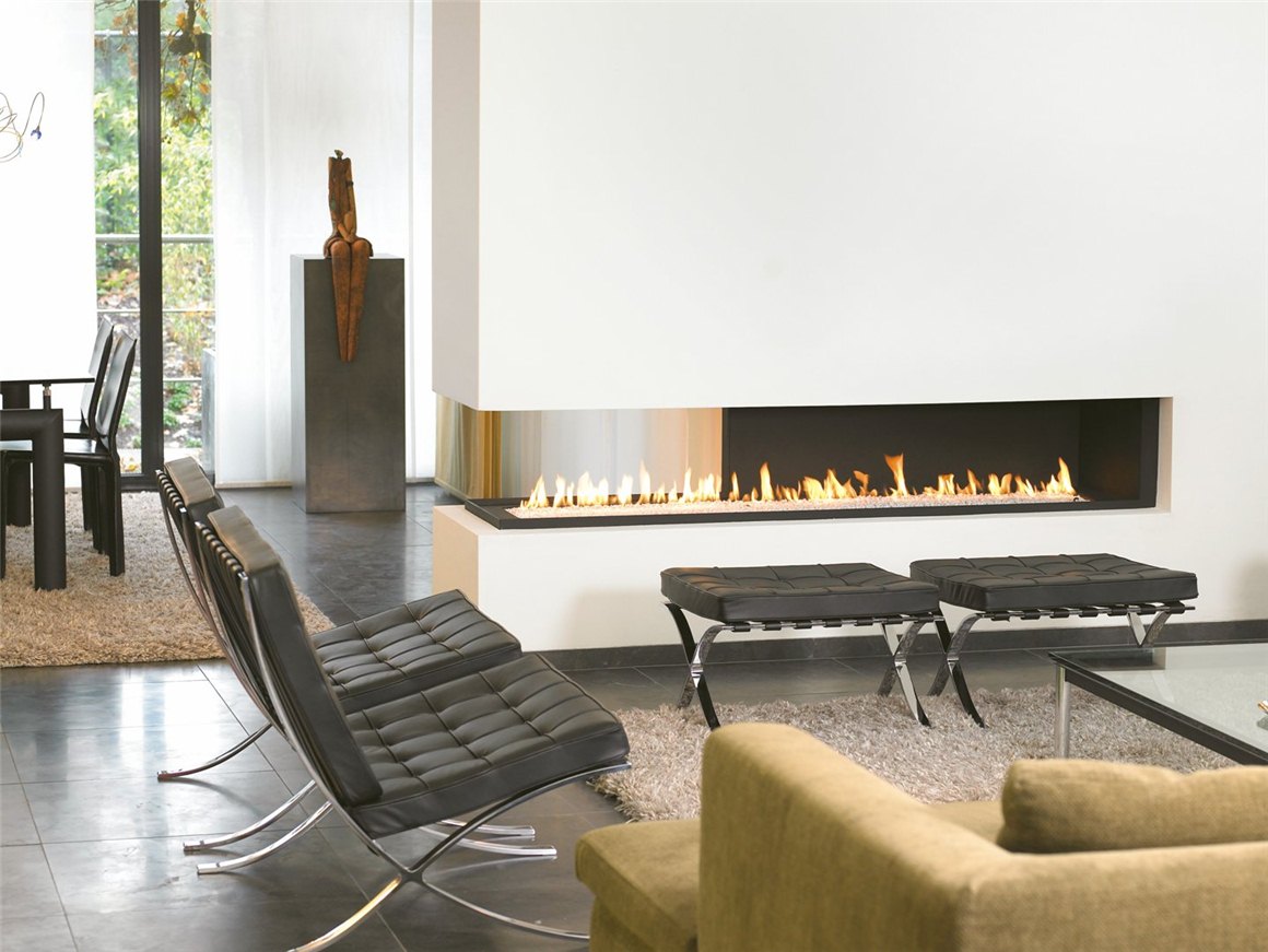 - Является центральностоящей разновидностью камина. Газовая топка шириной 2500 мм может быть изготовлена для фронтальной, сквозной компоновки, или же на эркере разделительной стены.