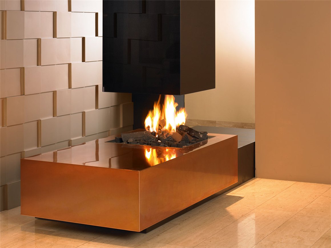 - Камин подходит для сжигания газа или древесины. Газовый или дровяной центральный камин из дымчатого стекла и столешницей из полированной меди.