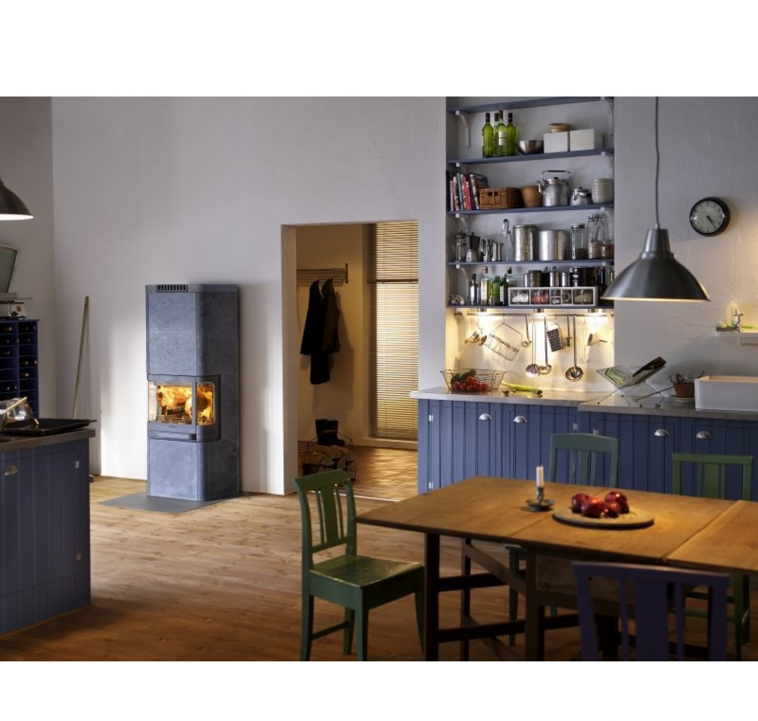 Печь-камин Contura 26T в облицовке из талькомагнезита. Оснащен чугунной решеткой, выдвижным зольником и широким фронтальным стеклом. Камин может быть оснащен вентилятором и теплонакопительным блоком: это позволит отапливать помещение в течение восемнадцати часов после угасания огня. Поток горячего воздуха регулируется с помощью шиберной заслонки, размещенной в верхней части камина.