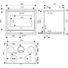 Диаметр выходного патрубка рассчитан на диаметр подключаемой дымоходной трубы в 150 мм. Дымосборник и цоколь окрашены в белый цвет. Притопочная зона выложена огнеупорной керамикой. Встроенные системы "чистое стекло" и "двойной дожиг" топлива.