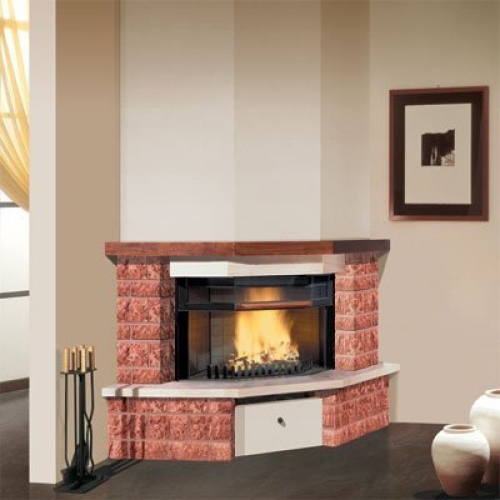 Эта угловая облицовка Siviglia, выполненная из красного камня, имитирует кирпичную кладку. Отделка белым мрамором и балка из темного дерева удачно дополняют эту лаконичную модель. Кроме того, этот камин оснащен удобным ящиком для хранения дров, отделанным благородным белым мрамором.