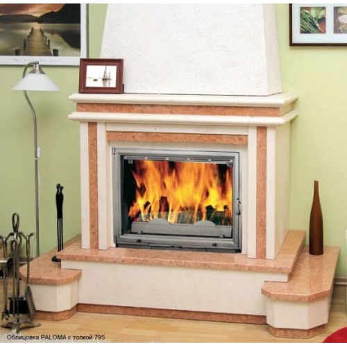 Внутренние размеры облицовки 800х600 мм, дополнительно комплектуется доборными мраморными пластинами для установки топки.
