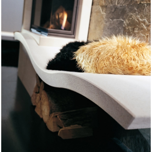 Угловой камин Palazzetti Goa из полированного мрамора Bianco Mediterraneo с полкой из белого камня.