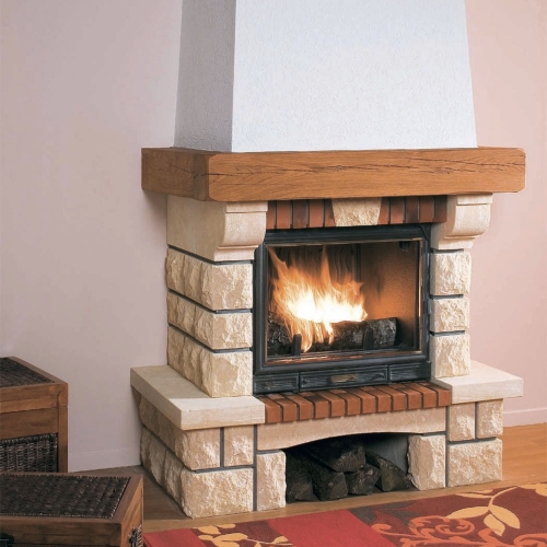 Пристенный камин, облицованный песчаником Dordogne. Декоративная балка выполнена из массива дуба. Закрытая топка со стеклянной дверцей из термостойкого стекла. Ниша для дров.