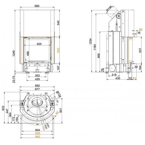 Стальная топка со сферическим стеклом. Подъёмная дверца (система Easy-Lift). Горизонтальное открывание двери для чистки стекла. Ширина дверки 525 мм. Высота - 486 мм. Возможно подключение воздуха из-вне.