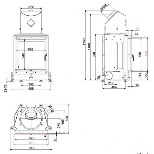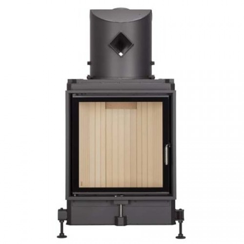 Стальная топка с прямым стеклом. Боковое открывание двери. Ширина дверки 536 мм, высота - 548 мм. Возможно подключение воздуха из-вне.