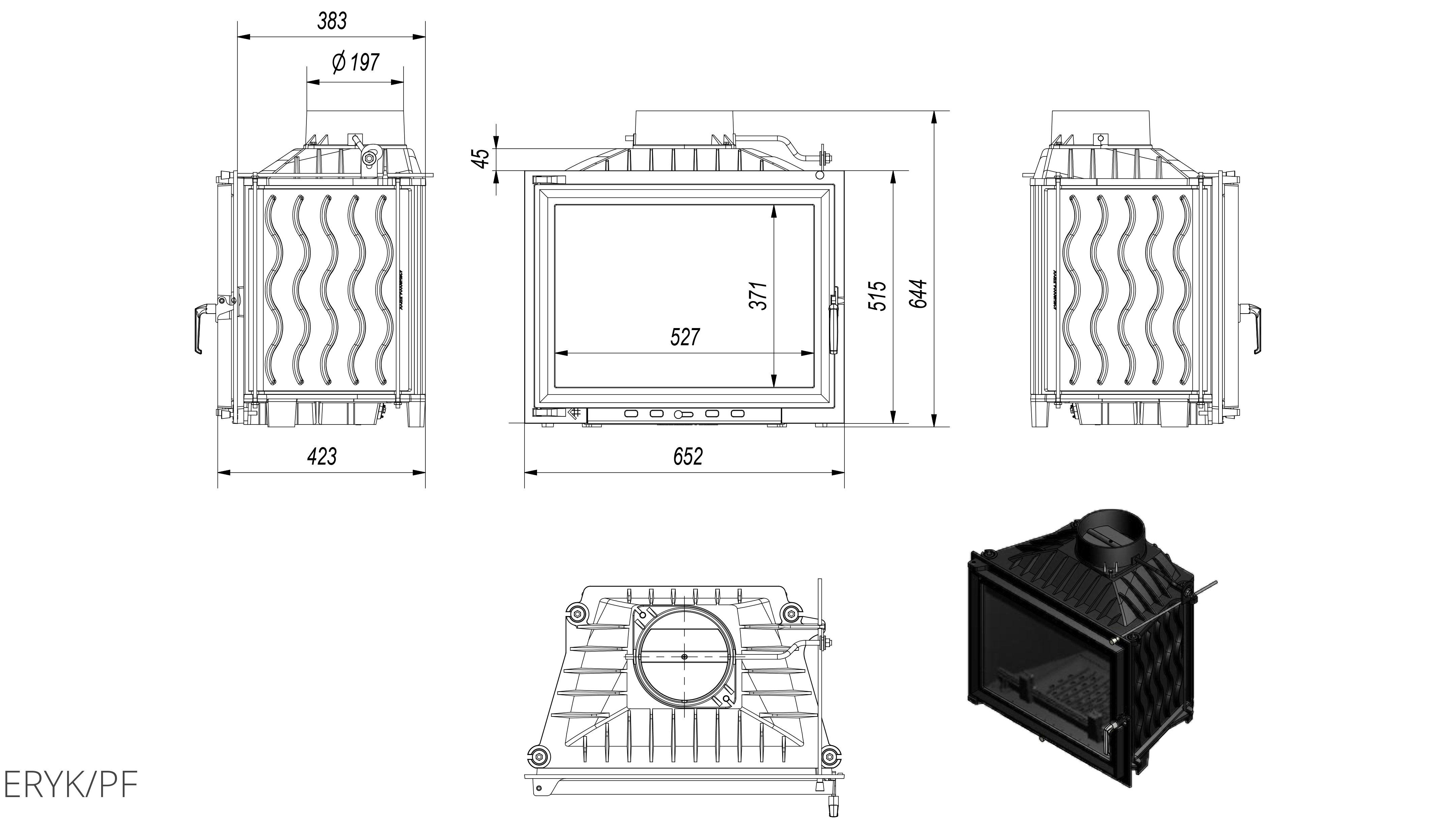 Топка из чугуна для дровяного камина Eryk, встраиваемого типа, производитель Kratki. Для производства топочных камер серии Eryk производитель использует чугун высокого качества (класс 200), прочное стекло марки «Робакс» выдерживает высокую температуру.