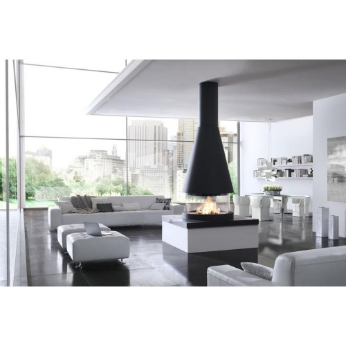 Круглый очаг, подъемная дверца с автоматической системой подъема и опусканий, панорамное стекло 360°.