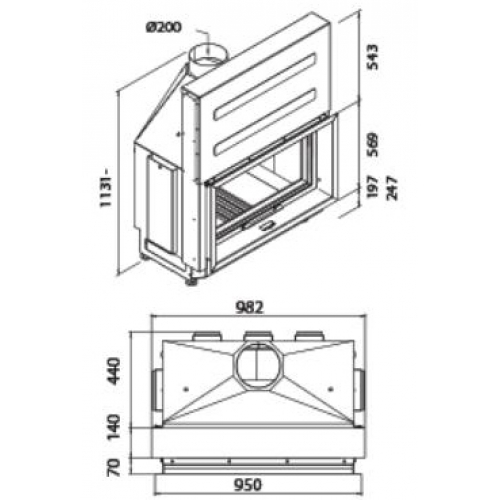 Каминная топка оборудована системами подачи внешнего воздуха для горения и системой самоочистки стекла, верхней подачи воздуха для горения(подовая топка).  Стенки топочной камеры облицованы шамотным камнем, для предотвращения прогорания корпуса и увеличиния срока службы прибора. Подьемный механизм двери, плавный и бесшумный, тросовый с использованием специальных подшипников качения. Вставка имеет регулируемые ножки для удобного монтажа.