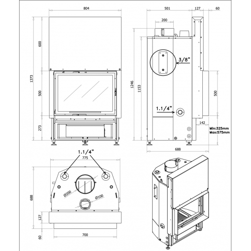 Дровяная топка с закрытым водяным контуром. Представленная модель оснащена дверцей с подъемным механизмом. Дверь оборудована окном из прозрачного стекла. Внизу расположен выдвижной зольный ящик. Корпус топки и  топочная камера изготовлены из огнепрочной стали. Объем бака для воды - 70 л.
