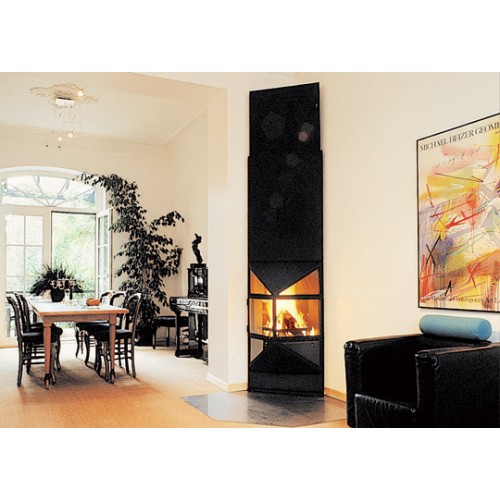Огонь виден со всех точек, горит как при открытых, так и при закрытых дверцах. Легко устанавливается с телескопическим верхом. Требует для себя маленькой площади пола, возможна установка как в углу, так и к плоской стене – эти качества позволили этой модели завоевать приз прессы на Французской выставке улучшения жилища в Париже.