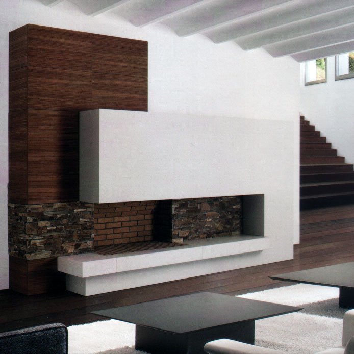 Камин, плита из полированного Югославского мрамора, укладка из натурального камня, плитки и бруса без шва. Декоративный элемент из дерева Teka. Топка из огнеупорного кирпича 120 2L.