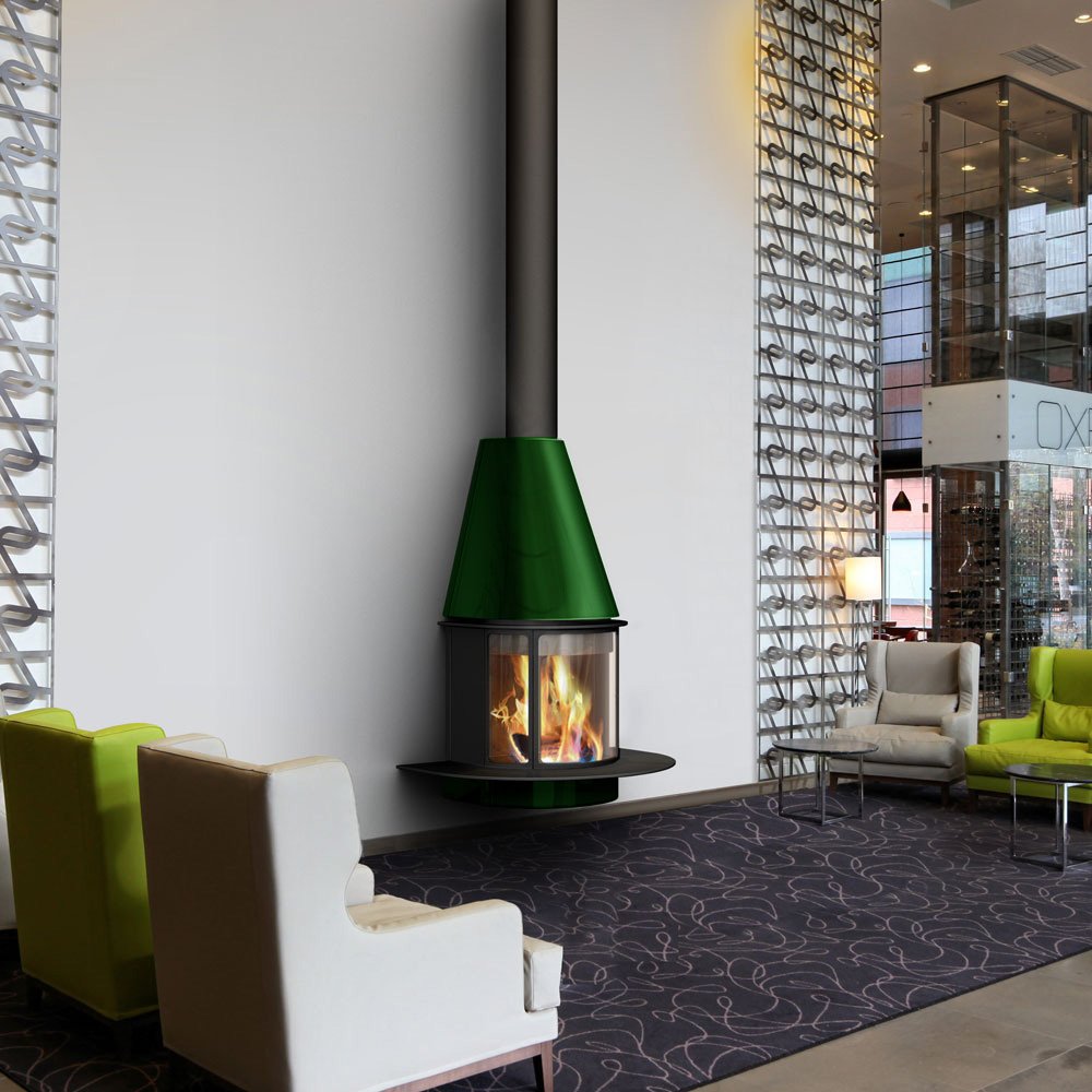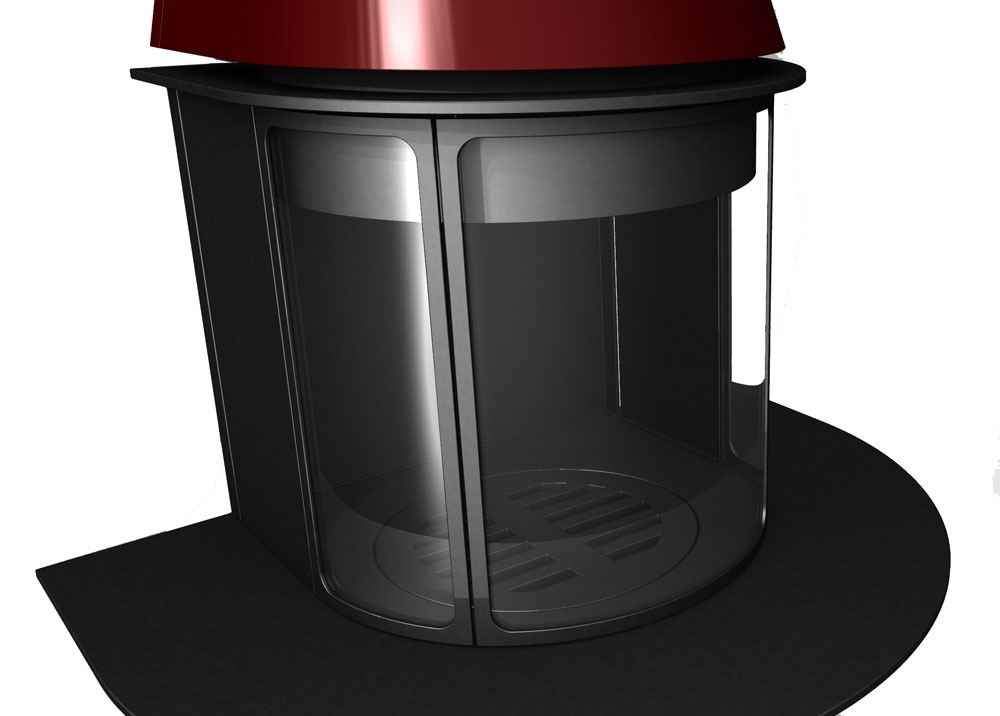Фронтальный подвесной полукруглый камин с полукруглыми стеклами. Цвет - черный. Верхний кожух - любой цвет палитры RAL.