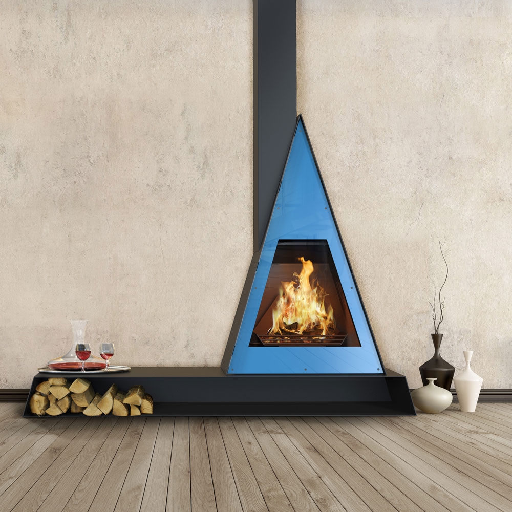В зависимости от общего оформления интерьера каминной залы, вы можете выбрать наиболее подходящий цвет фронтальной облицовки. Любопытная треугольная форма камина отсылает наблюдателя к конструктивистским стилевым тенденциям прошлого века, получившим новое рождение в современном, а точнее даже футуристическом исполнении.