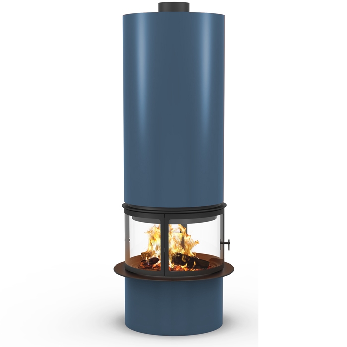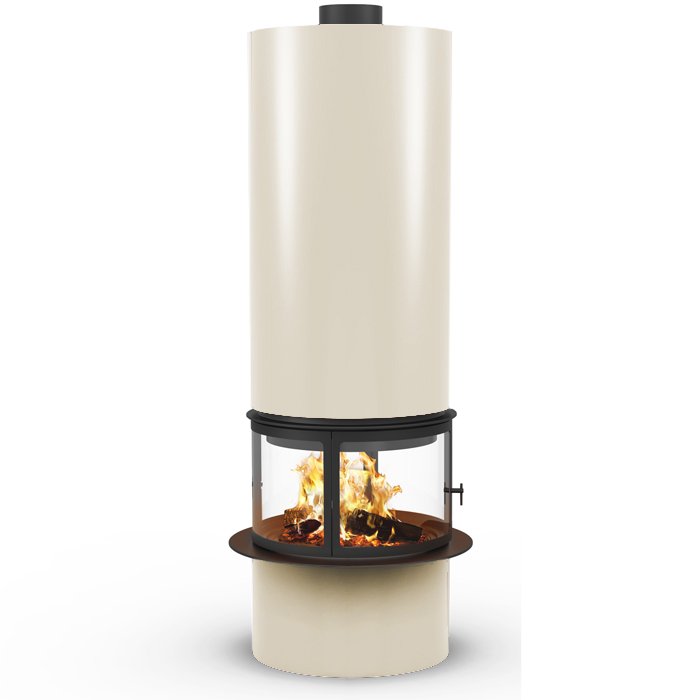 Центральный камин цилиндрической формы, с двойным корпусом. Составное стекло из 4 полукруглых частей. Изготовление в любом цвете палитры RAL.