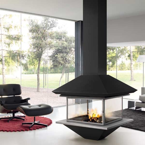 Центральный камин квадратной формы с двойным корпусом, составное стекло из 4 частей. Цвет - черный.