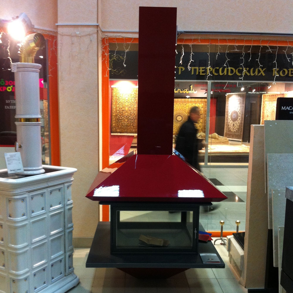Центральный камин квадратной формы с двойным корпусом, составное стекло из 4 частей. Цвет - любой из палитры RAL.