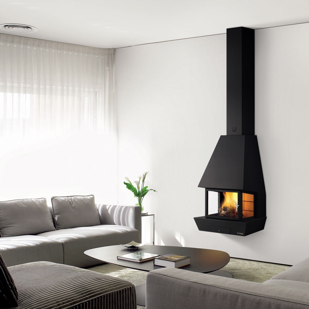Фронтальный подвесной камин со стеклом и крепежом к стене. Камин с изолированным дымоходом, мощность 9,8 кВт, имеется подвод воздуха извне.