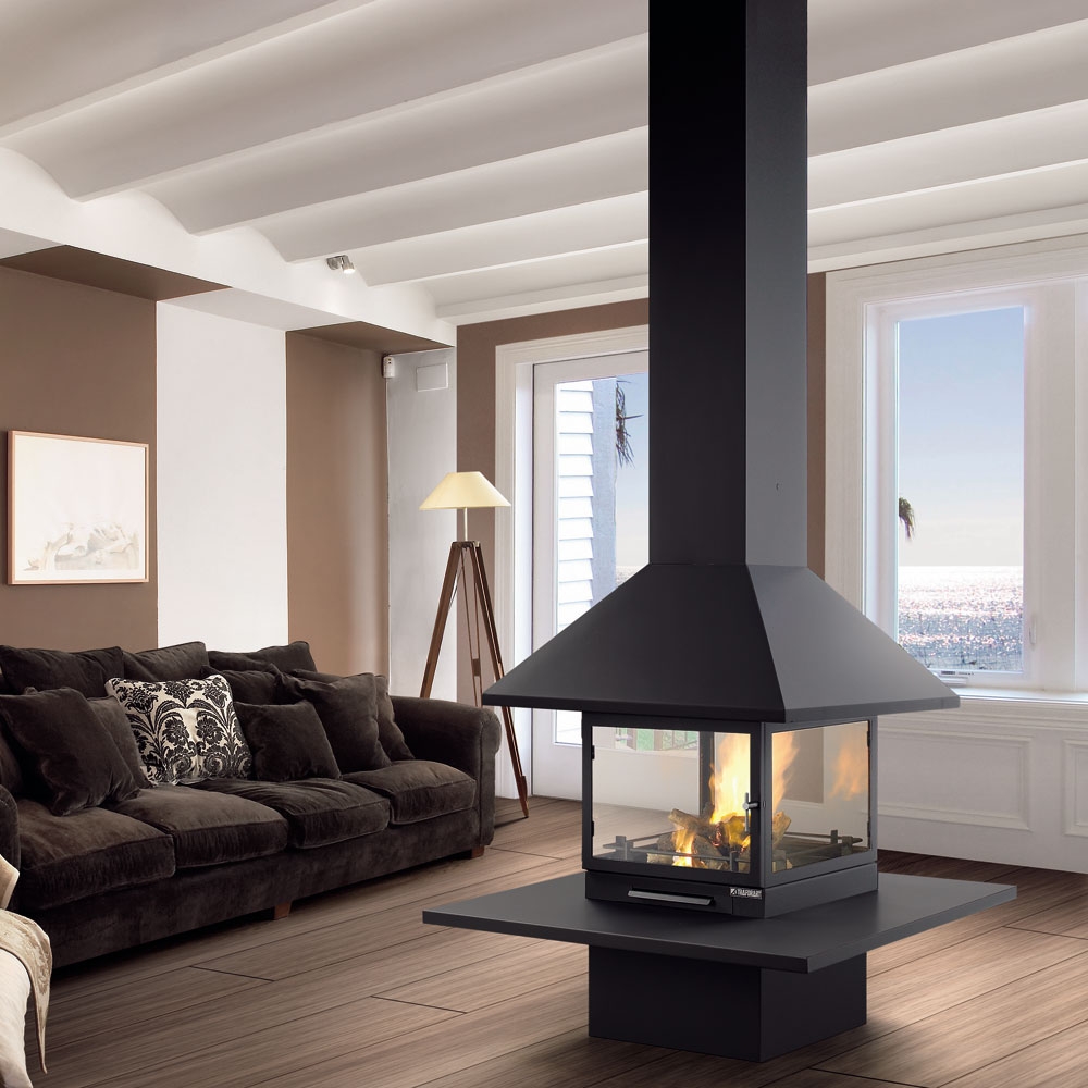 Классический центральный камин, простой в установке и безопасный в эксплуатации. Со стеклом, полка - керамика, цвет камина - черный.