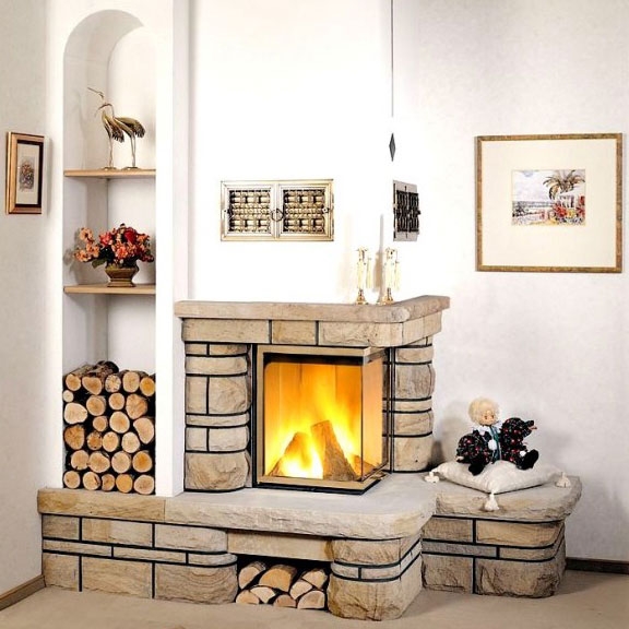 Угловой камин из натурального камня Sandstein bossiert, Simse geschliffen.
