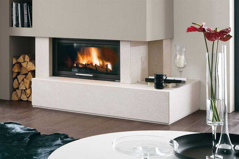 Отделка, выполненная из камня Bianco Mediterraneo. Угловой камин, правый.