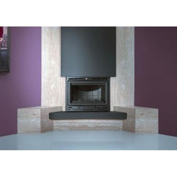 Угловой камин из полированного Travertino, пропитанного прозрачными смолами. Плита и короб полукруглой формы, металлические, черного цвета. Топка Insert Optimus.