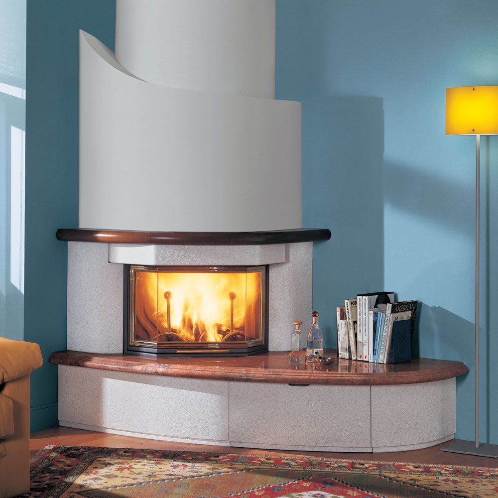 Облицовка из белого бучардированного камня со столешницей из полированного мрамора Rosso Alhambra. Балка, шпонированная орехом. Угловой камин, правый.