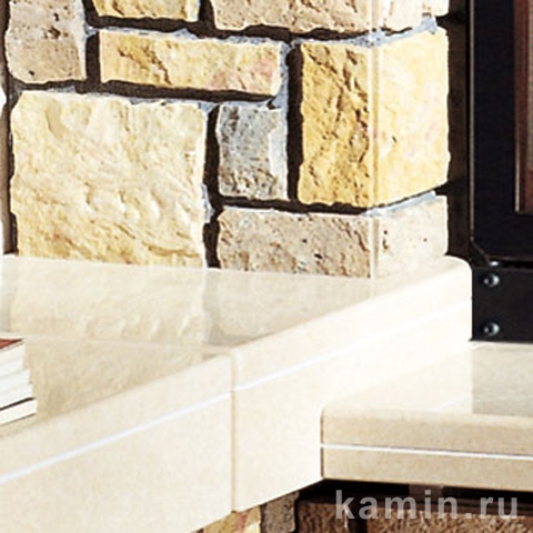 Угловой камин в стиле кантри под закрытую топку, высота цоколя - 38 см. Изготовлен из мрамора Vicentini грубой обработки с плитой из полированного мрамора Trani и дубовой балкой.