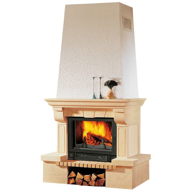 Пристенный камин из камня Dordogne. Резьба по камню сделана вручную. Широкая гамма совместимых топок. Кожух устанавливается отдельно.