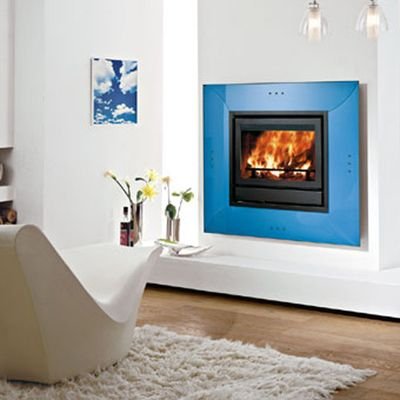 Каминная рамка из закаленного и сериграфированного стекла голубого цвета.