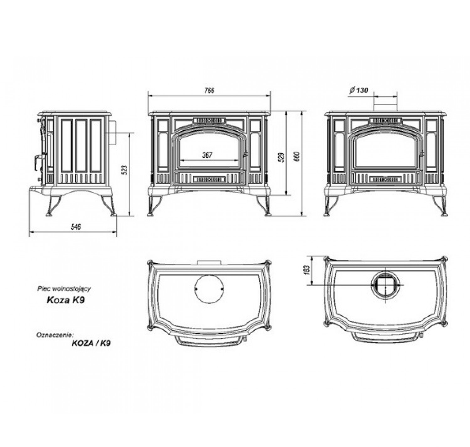 Чугунная печь польской компании «Kratki.pl» выделяется из модельного ряда высокой мощностью (до 14кВт), дизайном в классическом стиле и строгими формами. Эта печь оснащена турбиной принудительной конвекции нагретого воздуха от печи в помещение. Наличие турбины в несколько раз повышает скорость прогрева помещения. Горячий воздух не «застаивается» около отопительного прибора, а сразу начинает поступать в непрогретые участки, благодаря постоянному воздушному потоку. Турбина потребляет небольшое количество электроэнергии, а эффективность работы печи в момент первоначального прогрева помещения повышается многократно. Присоединение дымохода возможно как сверху, так и сзади.