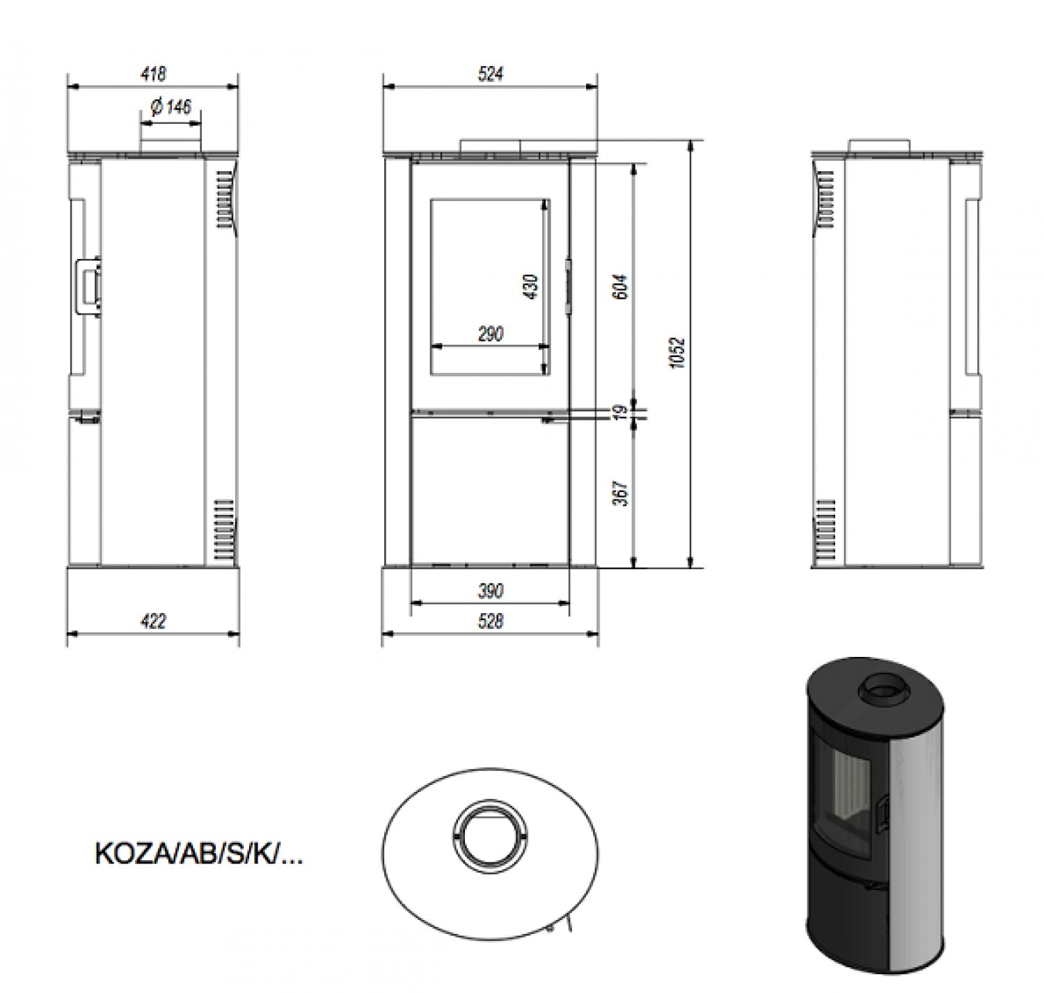 Новинка польского производителя Kratki.pl. Печь имеет современный дизайн, верхнее и заднее подключение к дымоходу. Материал: камера сгорания, корпус печи, верхняя плита и дверца изготовлены из стали. Дровяная печь koza AB/S/K облицована кафельными панелями. Ручка дверцы современного дизайна (опционально с доводчиком). Дверца с большим панорамным стеклом. Камера сгорания футерована керамикой Acumotte.