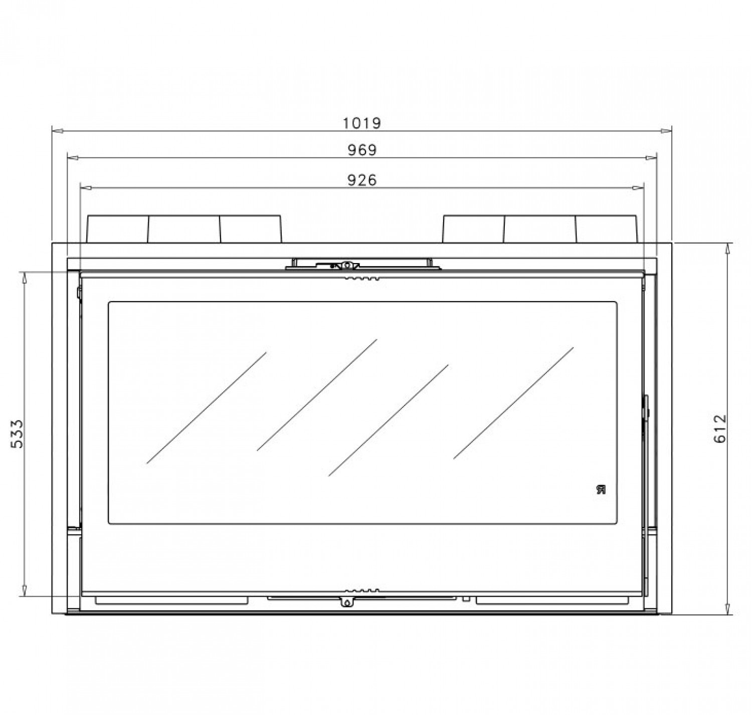 Стальной вертикальный инсерт с первичным и вторичным регистром подачи воздуха, благодаря чему перед попаданием в очаг воздух сначала прогревается. Стекло - шелкография.