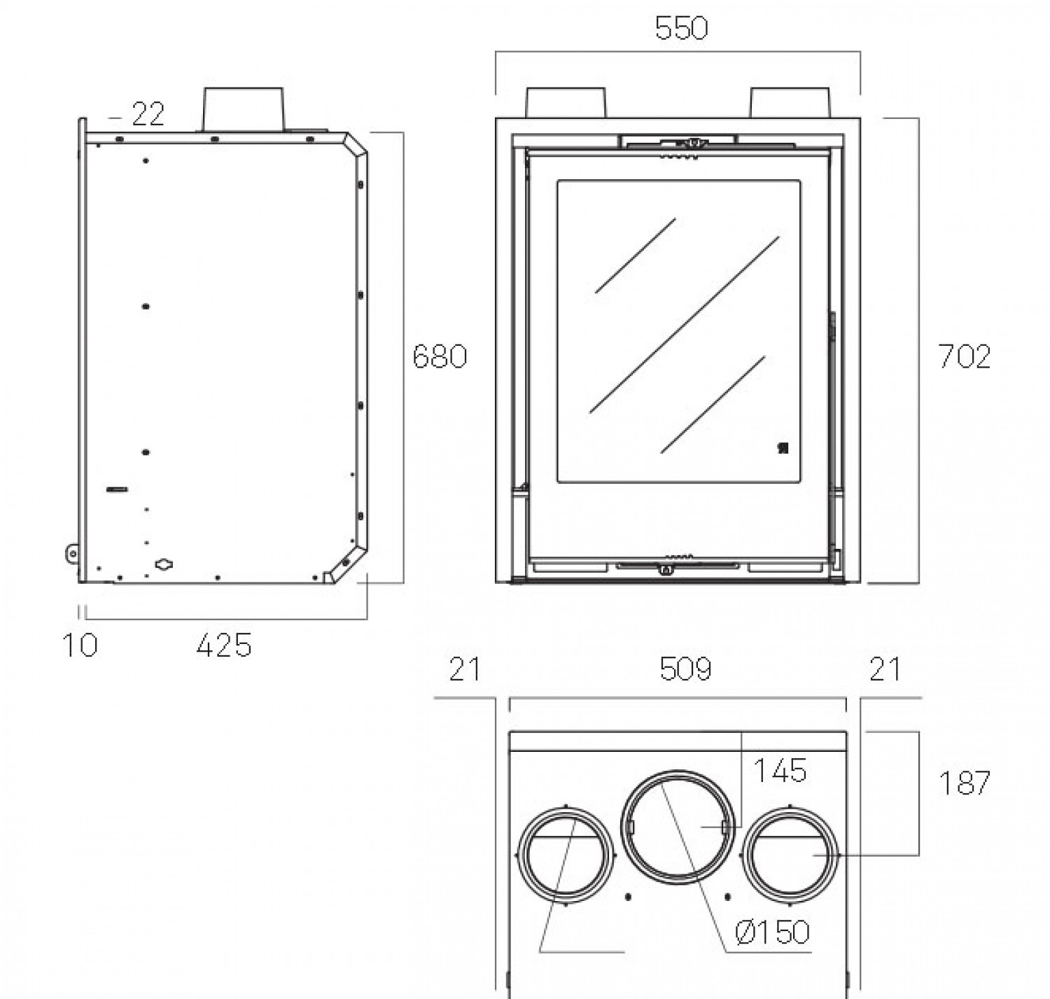 Стальной вертикальный инсерт с первичным и вторичным регистром подачи воздуха, благодаря чему перед попаданием в очаг воздух сначала прогревается.