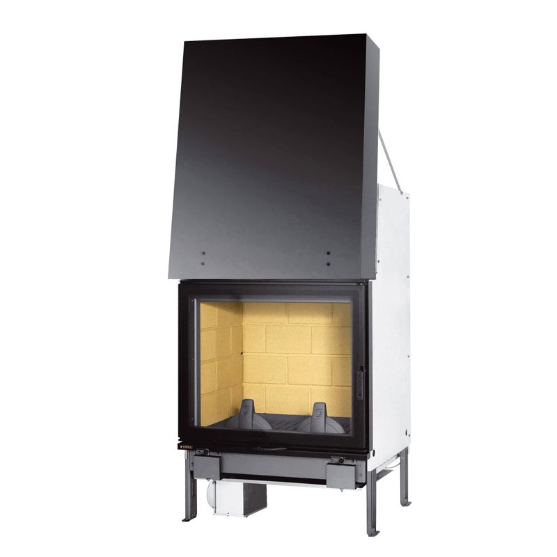 Универсальная топка изготовлена из чугуна, футирована шамотным кирпичом. Плоское стекло. Подъемная дверца.