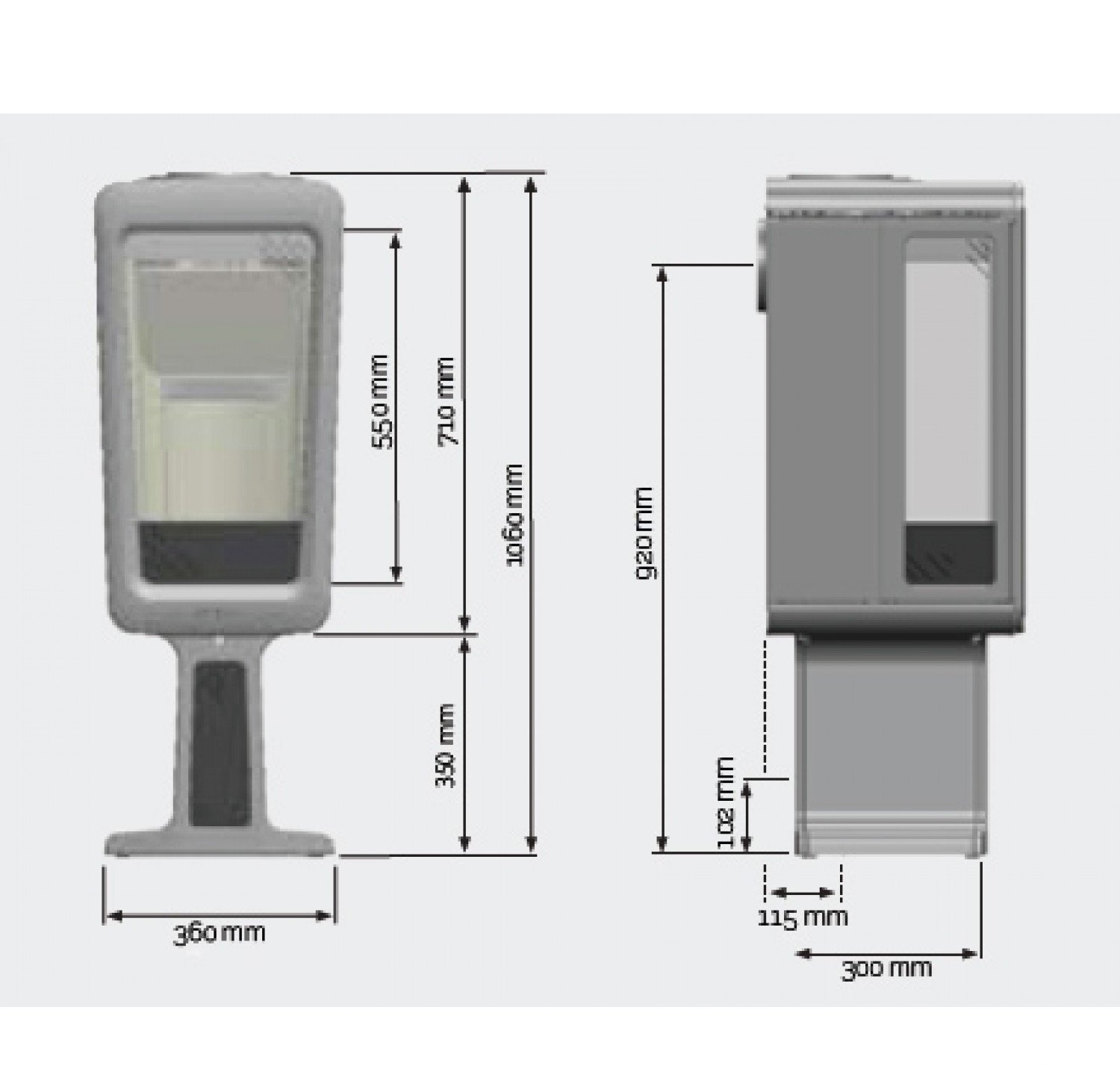Печь-камин Keddy K-815 серого цвета, изготовлена из чугуна. Большое центральное и 2 боковых стекла.