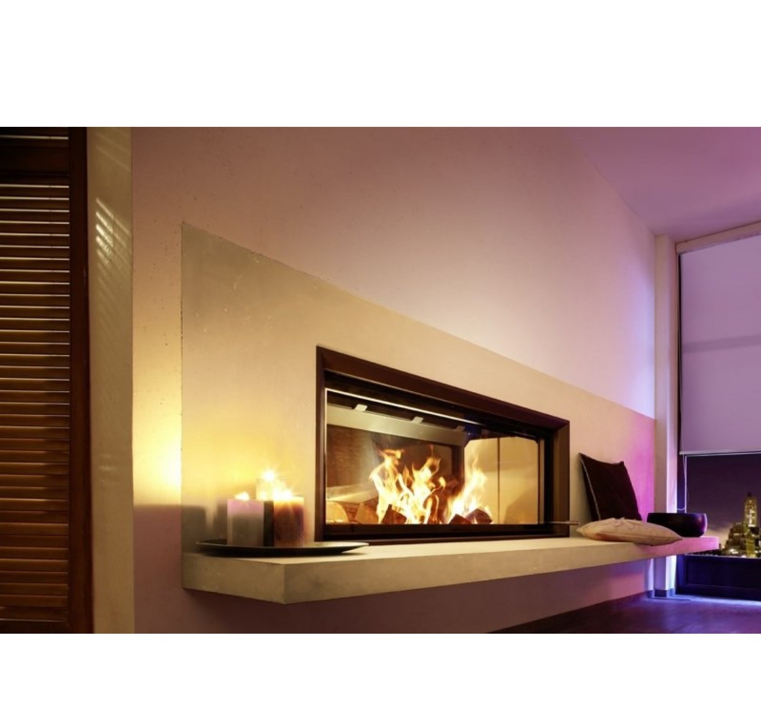 Каминная топка с прямым стеклом. Топочная камера футерована шамотом. Подъёмный механизм двери (система Easy-Lift). Ширина дверки 1350 мм. Высота дверки 538 мм. Возможно подключение воздуха извне.