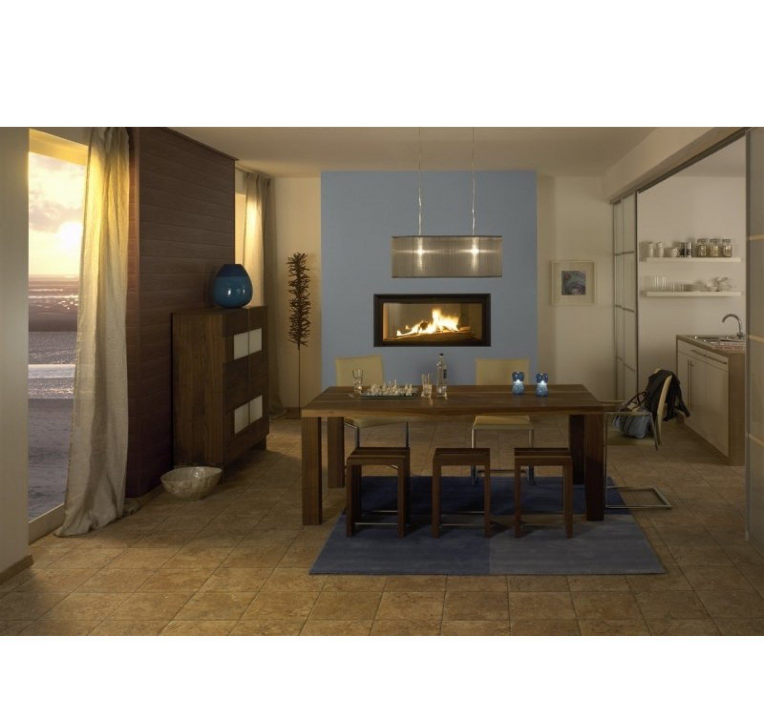 Двухсторонняя каминная топка с прямым стеклом. Топочная камера футерована шамотом. Подъёмный механизм двери (система Easy-Lift) с одной стороны. С другой стороны дверца откидывается для чистки. Ширина дверки 981 мм. Высота дверки 422 мм. Возможно подключение воздуха извне.