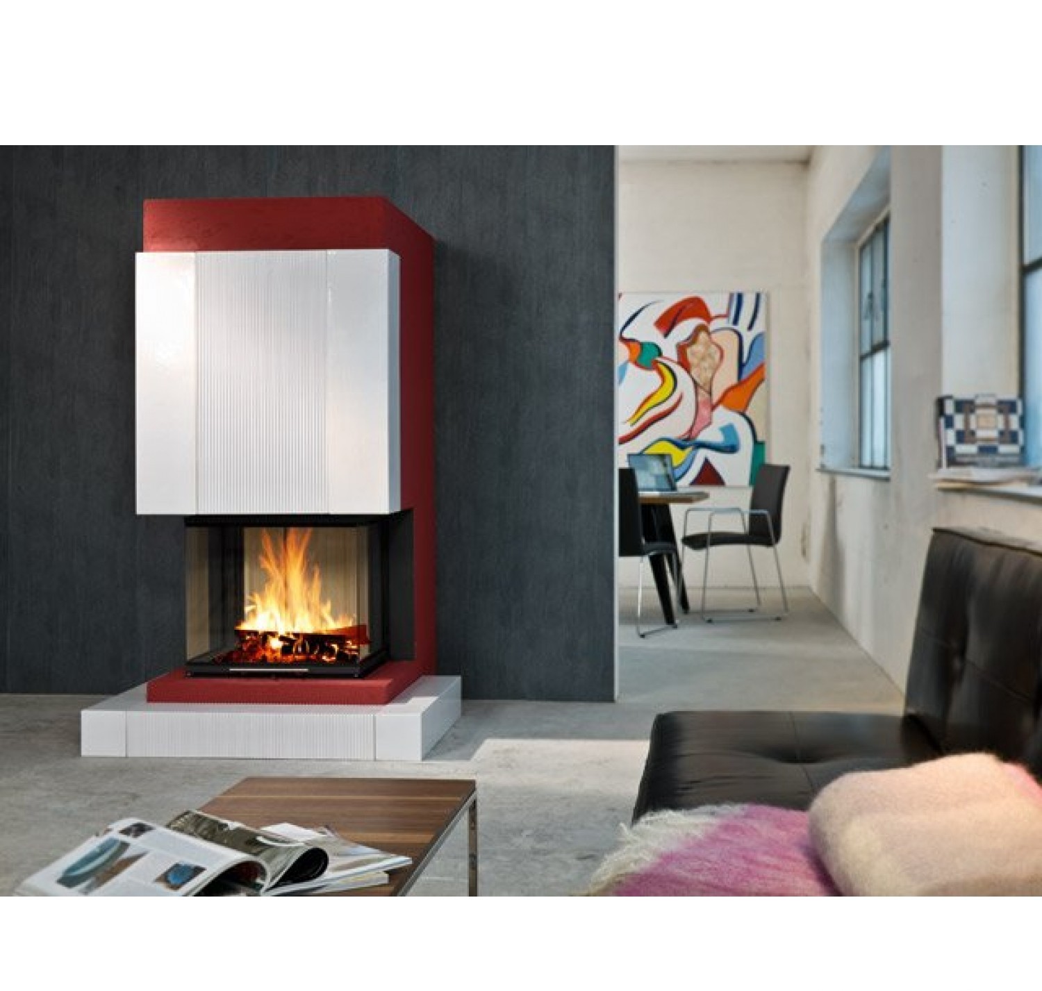 Трёхсторонняя каминная топка. Топочная камера футерована шамотом. Подъёмный механизм двери (система Easy-Lift). Ширина дверки 274+1015+274 мм. Высота дверки 479 мм. Возможно подключение воздуха извне.