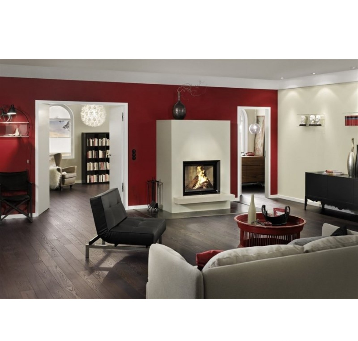 Каминная топка с прямым стеклом. Топочная камера футерована шамотом. Уменьшенная монтажная глубина. Подъёмный механизм двери (система Easy-Lift). Ширина дверки 760 мм. Высота дверки 635 мм. Возможно подключение воздуха из-вне.