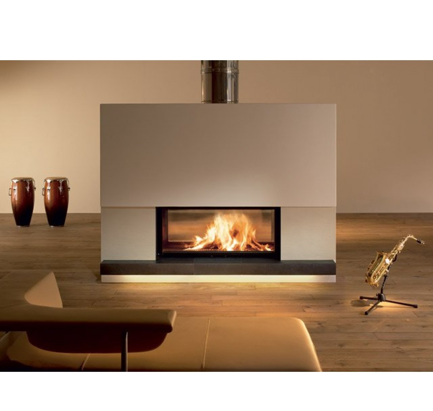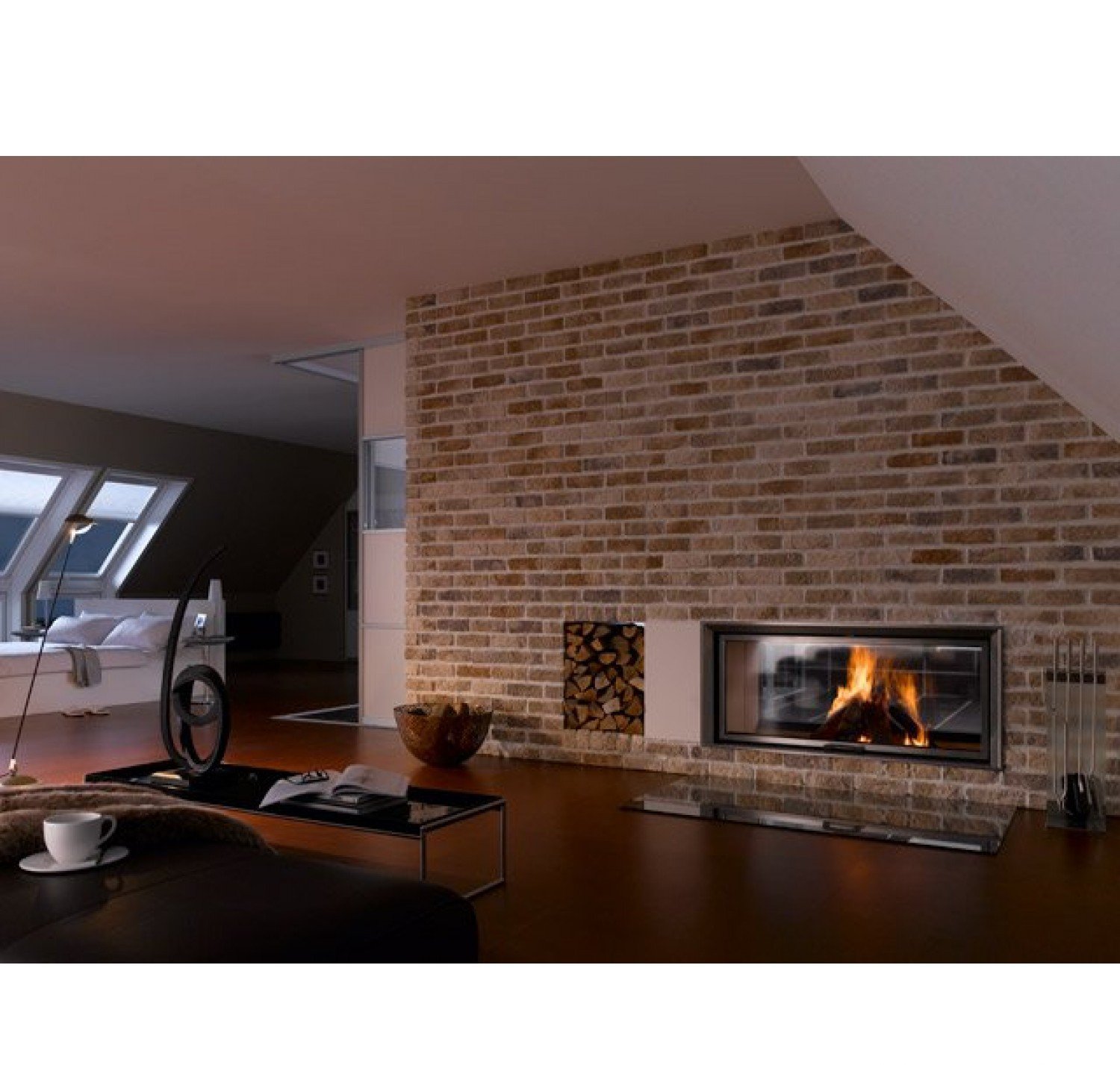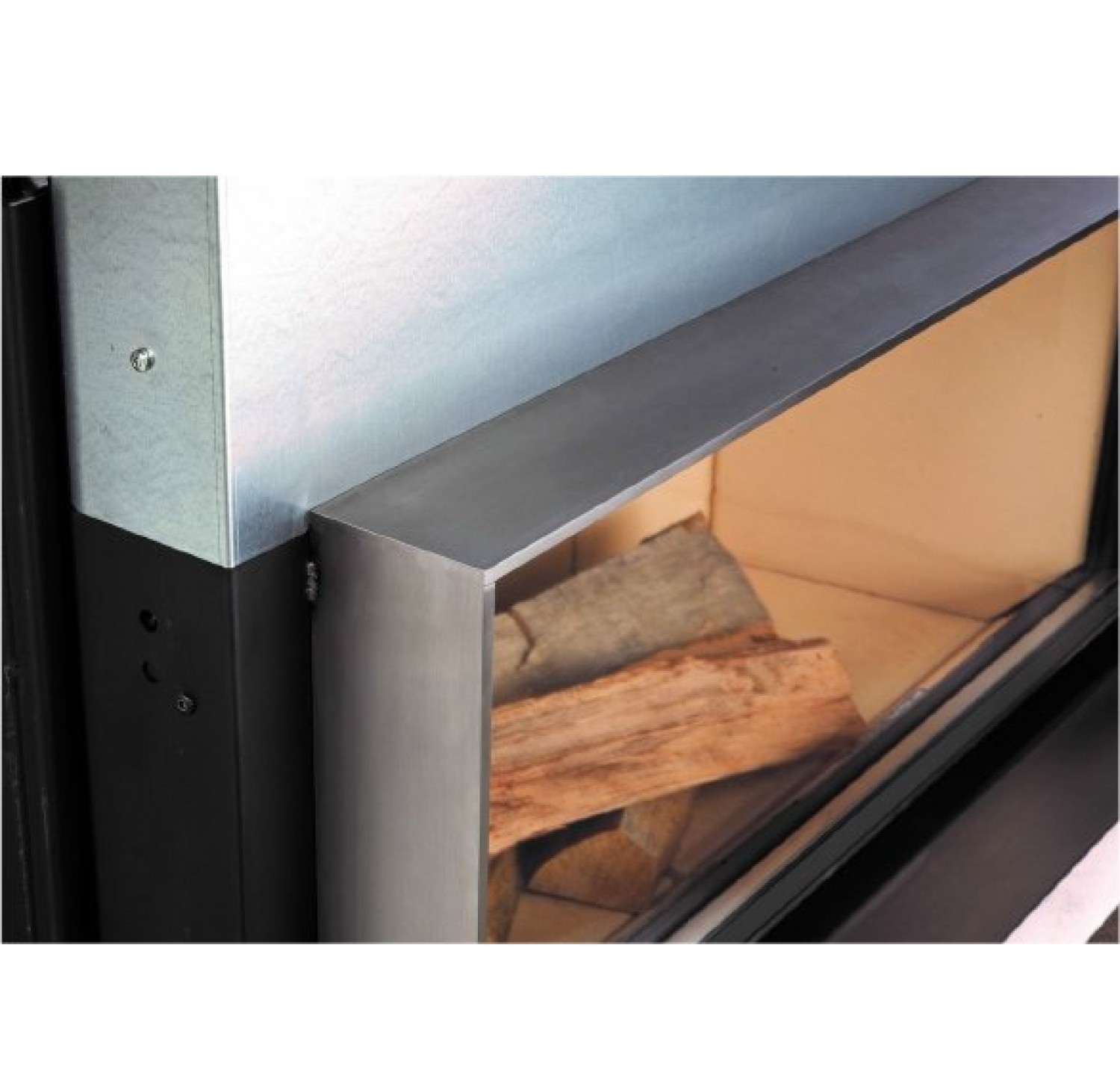 Двухсторонняя каминная топка с прямым стеклом. Топочная камера футерована шамотом. Подъёмный механизм двери (система Easy-Lift) с одной стороны. С другой стороны дверца откидывается для чистки. Возможно подключение воздуха извне.