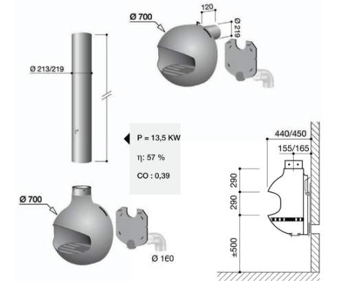 - с выпуклой стеклянной дверцей, труба в стене