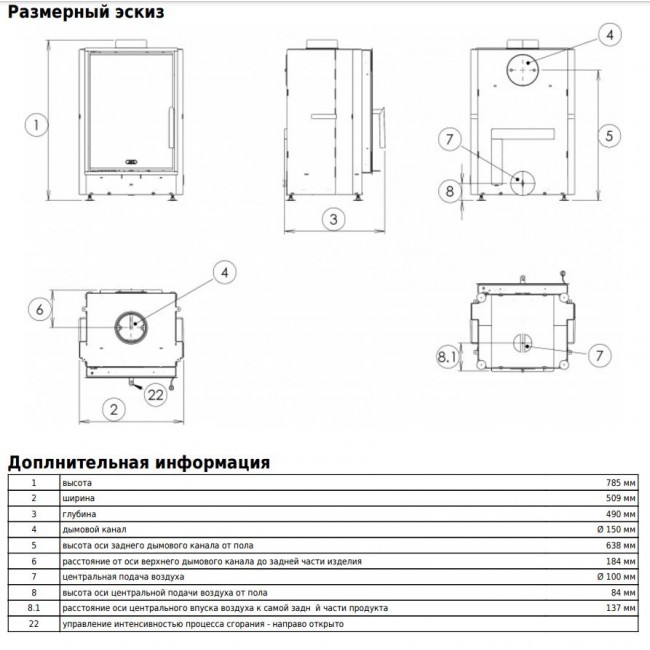 К этой топке подключается дымоход диаметром 150 мм. Вы можете заказать как готовый комплект, так и отдельные элементы.