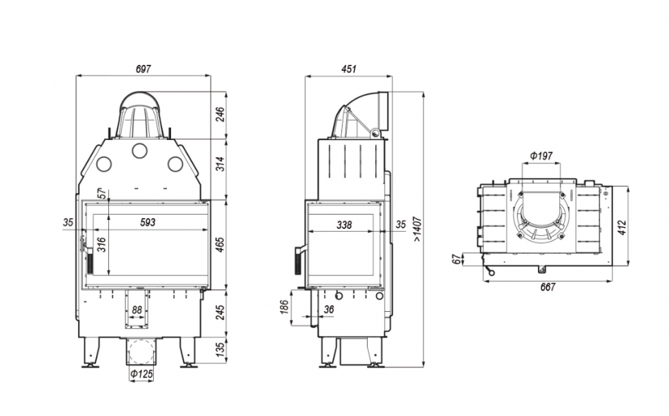 Модель изготовлена из стали с порошковым покрытием. Устройство с центральной подачей воздуха снаружи и возможностью ее регулировки. Специальная конструкция на трубе для подачи воздуха в топку, дает возможность изменить направление подачи воздуха на боковое. Плотно размещенные радиаторы способствуют передачи больше тепла окружающей среде, а воздуховоды повышают эффективность камина.